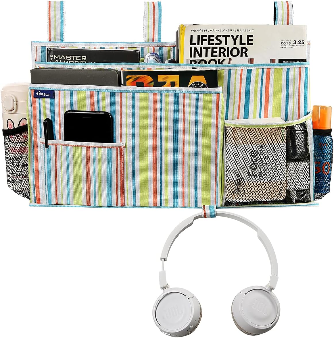 Surblue Bedside Caddy Hanging Bed Organizer Storage Bag Pocket for Bunk and Hospital Beds, College Dorm Rooms Baby Bed Rails, Camp 8 Pockets, (Large, Green Stripe)
