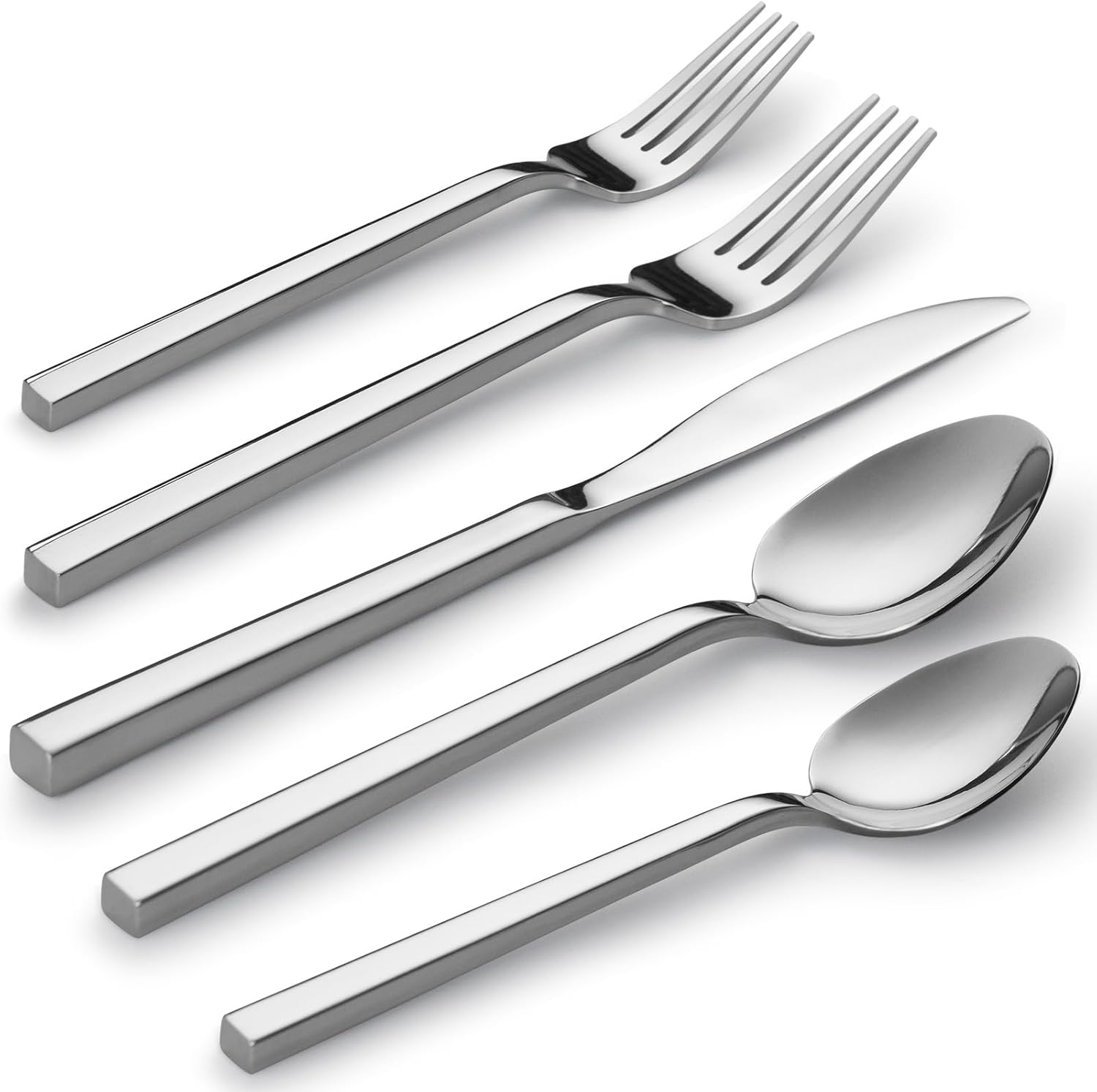 - DESIGN AND APPEARANCE: Classic square handle shape with mirror finish, natural and elegant design.Smooth and silk surface without grain, easy to clean and care in daily use. Crafted forged process, strong and durable,so that the flatware set has a thicker texture