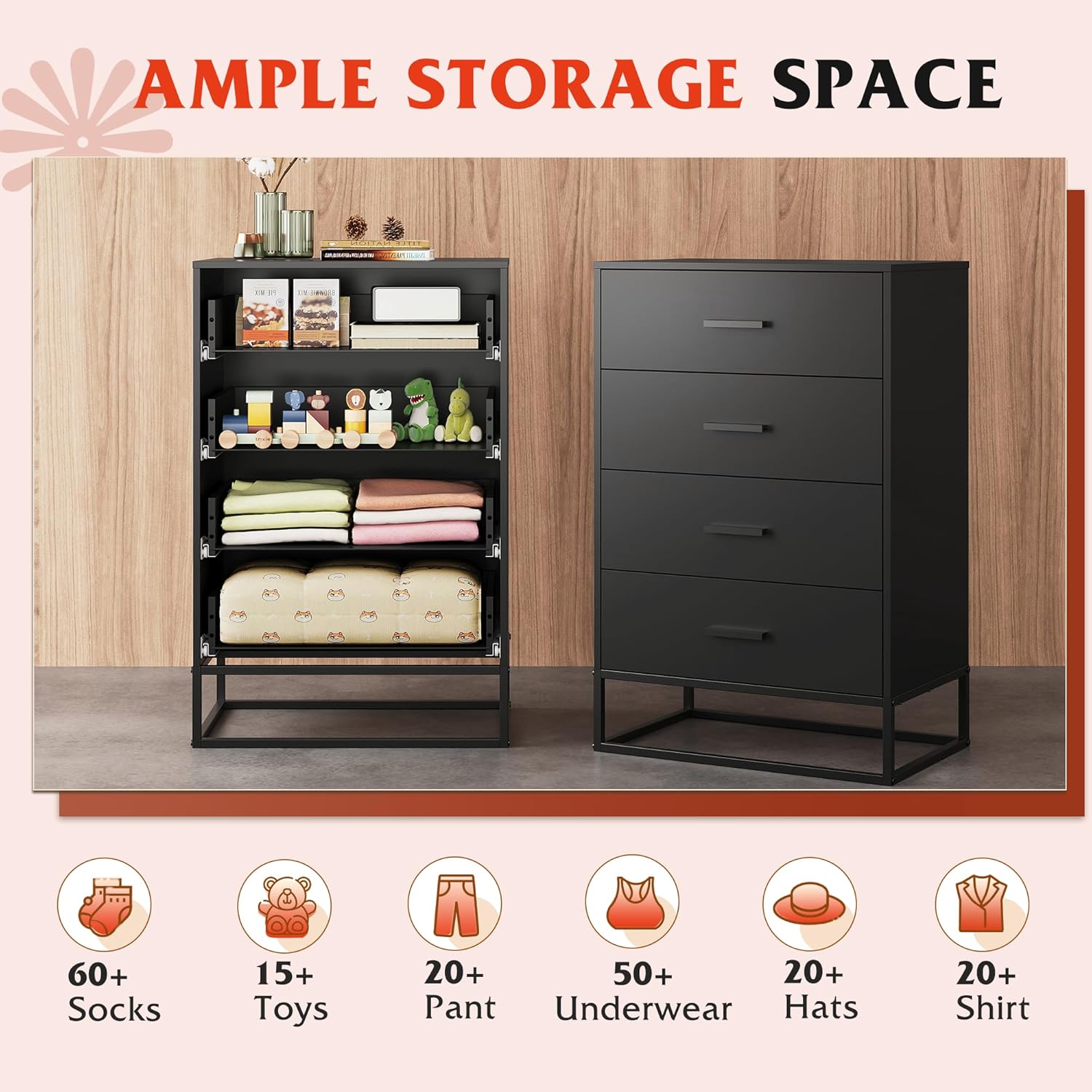 - 【Large Storage Space】The bedroom dresser has 4 drawers, which can meet all your storage needs. They can be neatly placed inside to help you sort items by type, and keep all items and accessories in order, and you can save a lot of time when picking up items. The wooden top can withstand up to 88 pounds, providing a hard surface for placing lamps, books, decorations, etc.