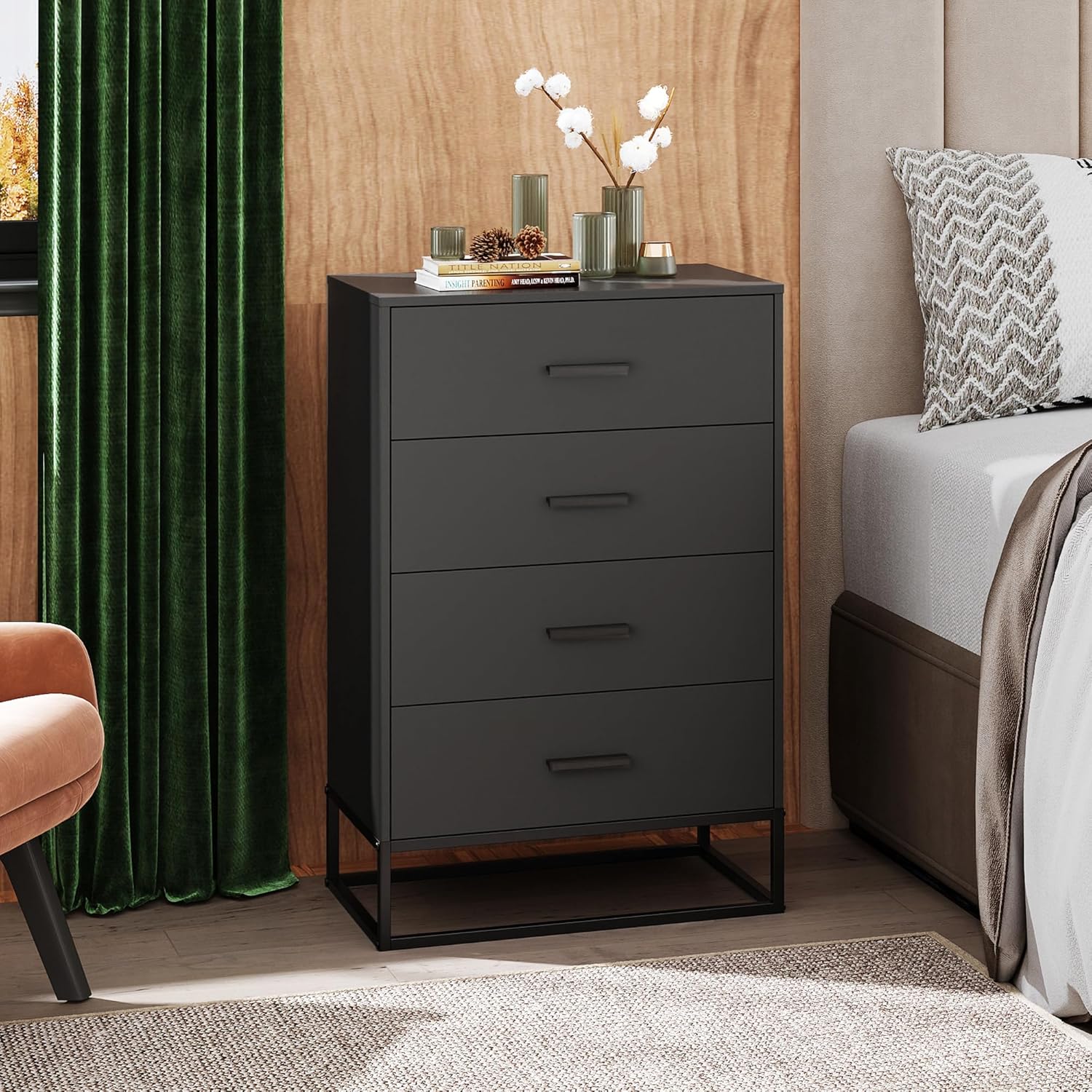 WLIVE Black Dresser for Bedroom with 4 Drawers, Tall Wood Dresser with Sturdy Metal Frame, Wooden Chest of Drawers for Hallway, Living Room, Closet