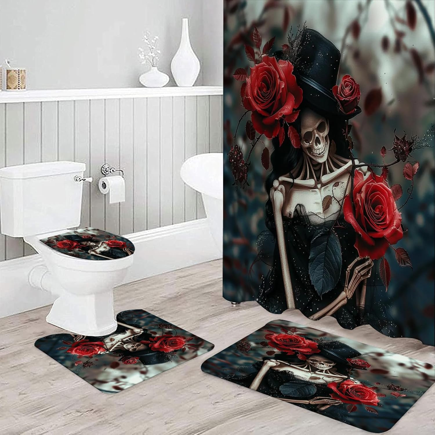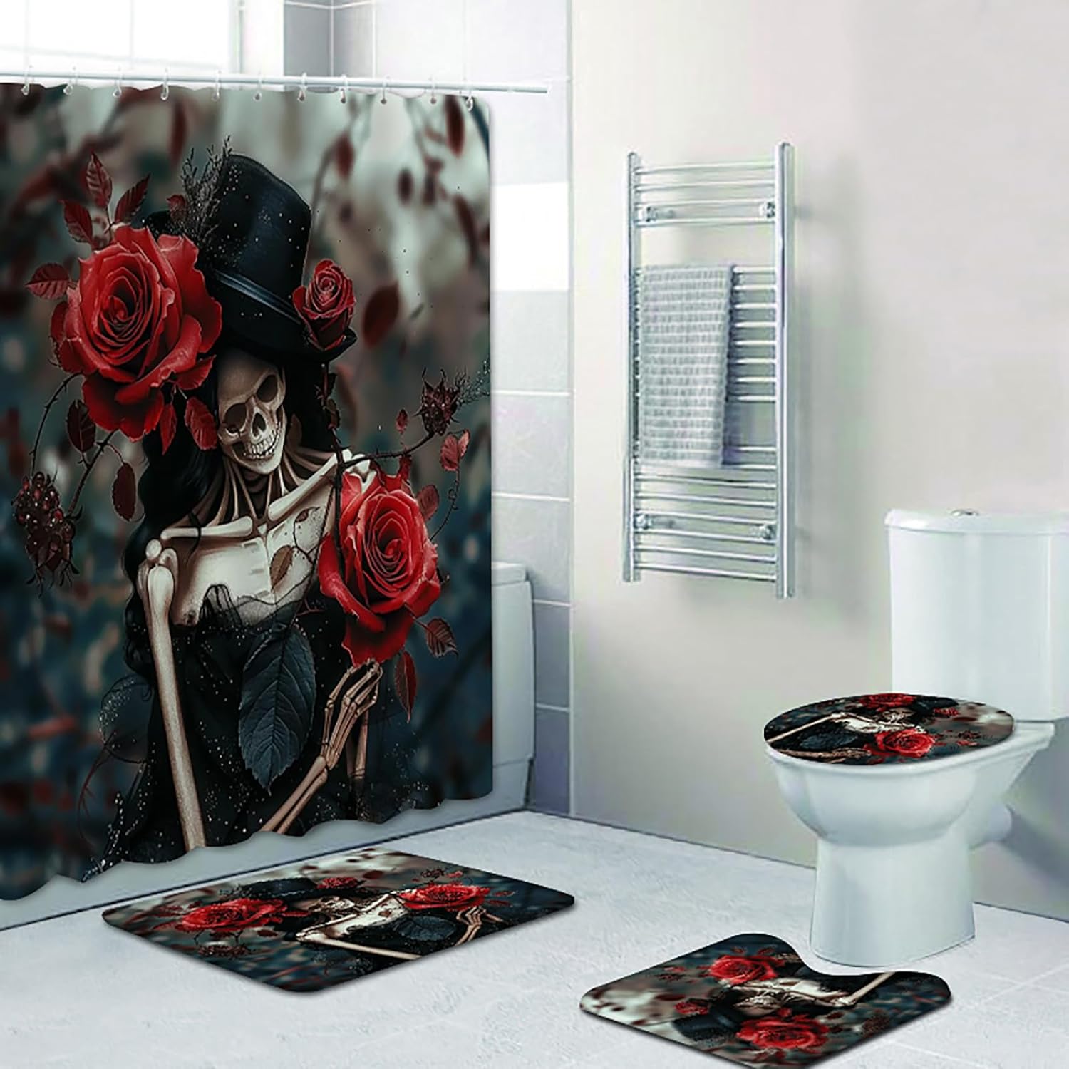 NEWSUYAA Halloween Decorations Shower Curtain Set with Non-Slip Rugs and Bath Mats,Black Skull Skeleton Bathtub Curtains with 12 Hooks,All Saints'Day (Nov 1st) Bathroom Decor