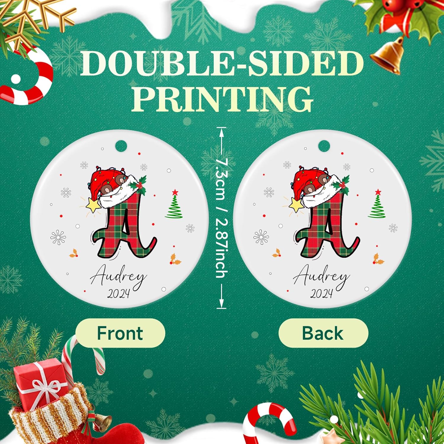 - 【Double-Sided HD Printing Christmas Ornament Personalized】Custom Christmas ornament for Christmas tree use HD printing technology, double-sided printing the same, bright colors,not easy to fade.About 2.87", you can type the family member name,we will print the name on the custom ornament, give personalized family ornament to him or her as Christmas gift ideas