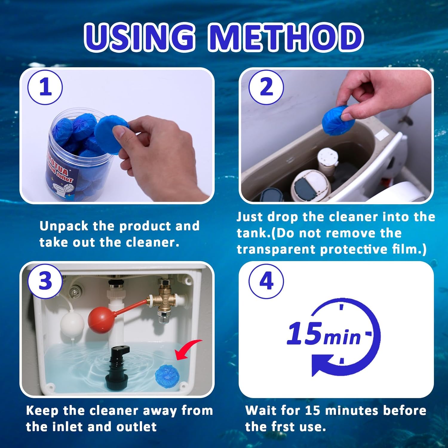 - EASY TO USE: Simply take one blue toilet tablet out of the box and place it in the toilet tank. Then, let it fully dissolve for at least 20 minutes until the water turns blue before flushing. (Please note, do not remove the water-soluble blue protective film) It will not cause any damage to the inside of the septic tank and toilet tank.
