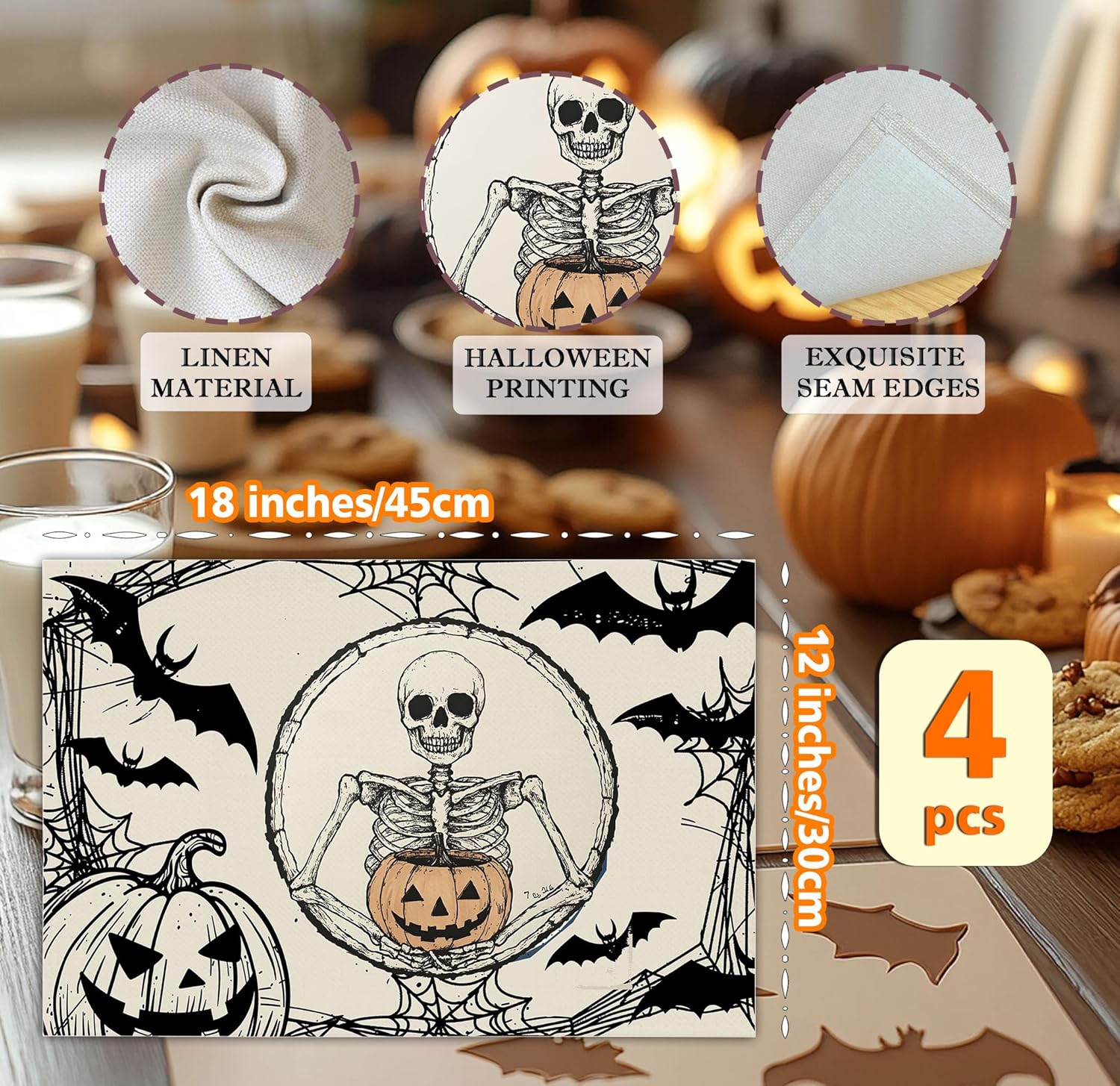Halloween Skeleton Placemats Set of 4, 12x18 Inch Pumpkin Bats Table Mats, Washable Heat Resistant Place Mats for Kitchen Dining Table, Spooky Themed Decoration for Home-B11