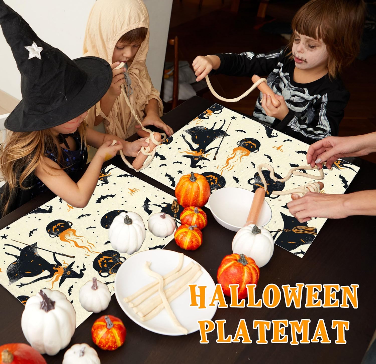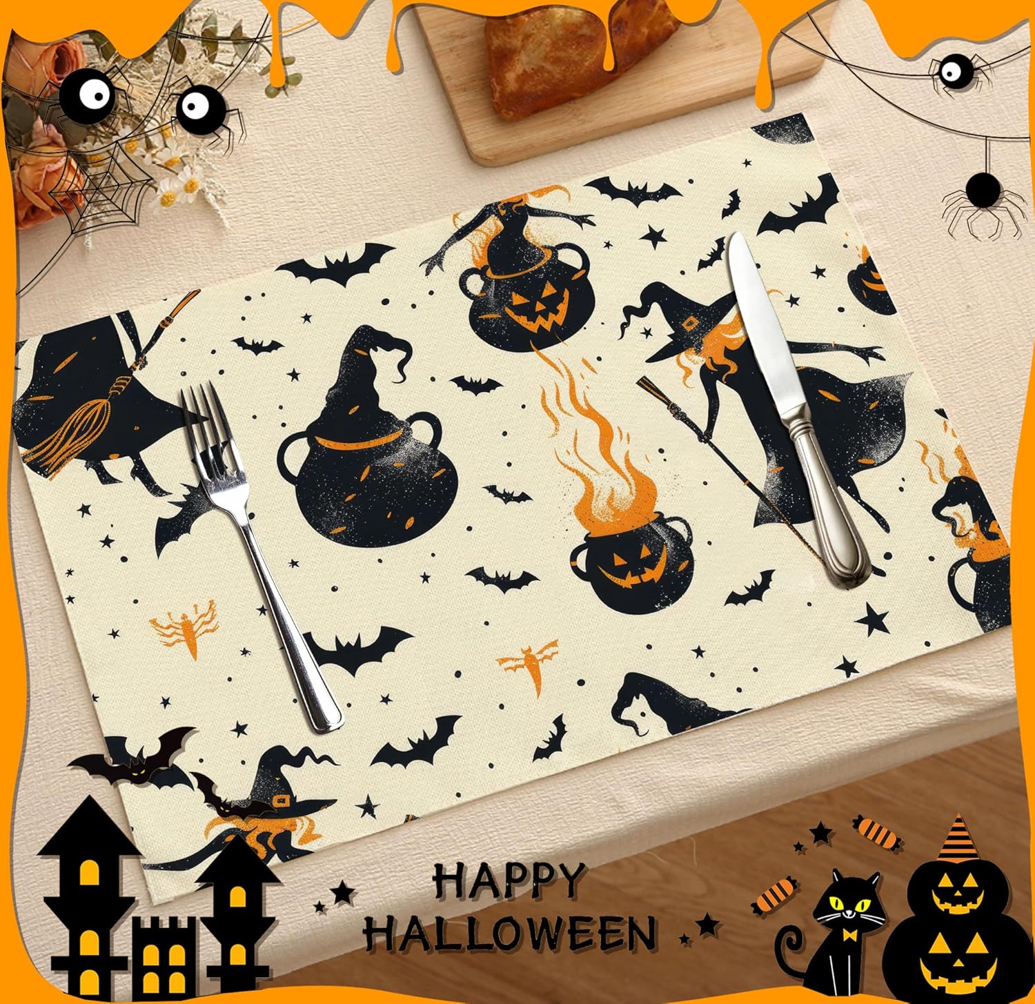 Halloween Spooky Placemats Set of 4, 12x18 Inch Pumpkin Witch Table Mats, Washable Heat Resistant Place Mats for Kitchen Dining Table, Halloween Themed Decoration for Home-B04