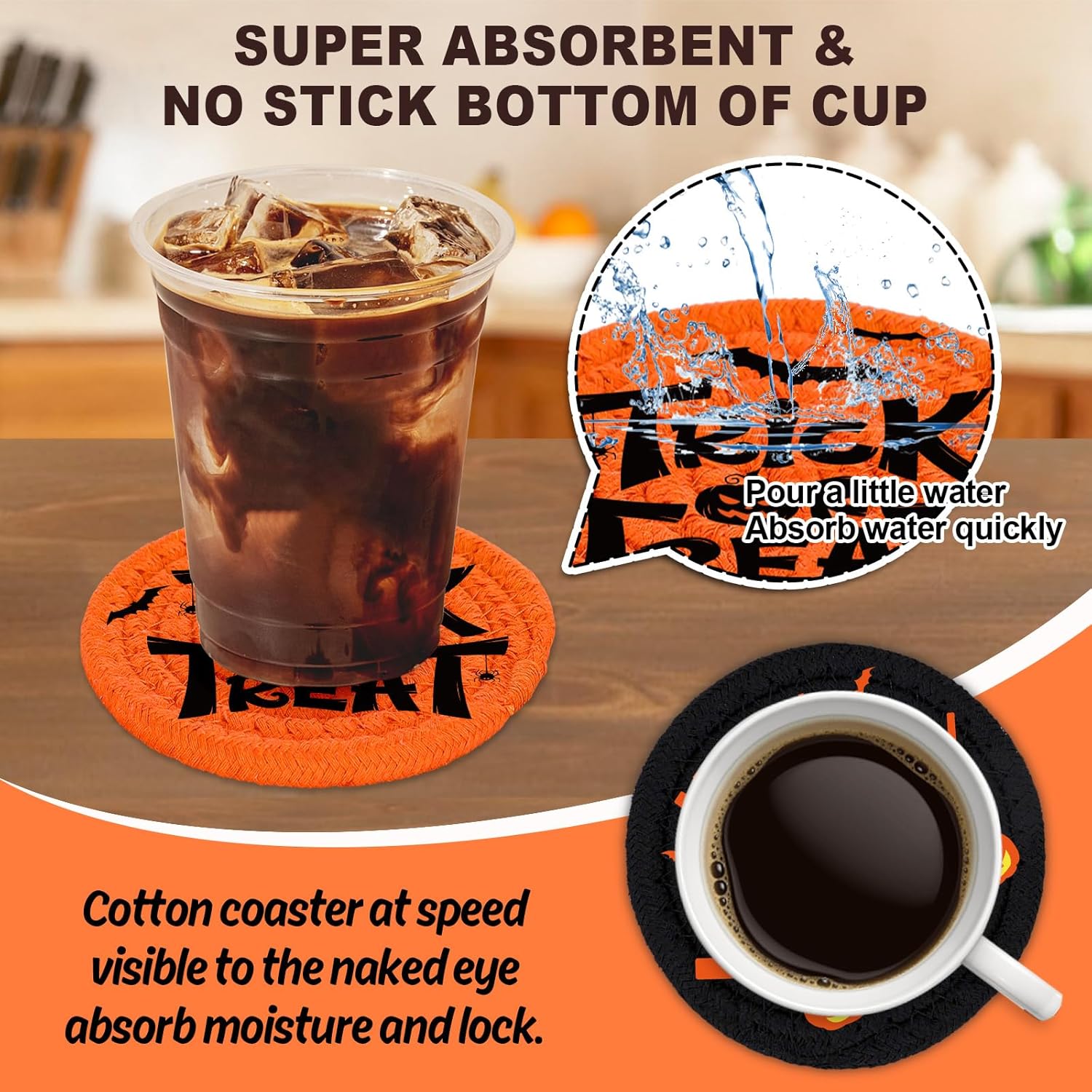 - Halloween Theme: Our cotton coasters are designed with pumpkin, bats and the words of ‘HAPPY HALLOWEEN’ and ‘TRICK OR TREAT’, mainly colored in black and orange, classic and delicate, will nicely increase festive atmosphere